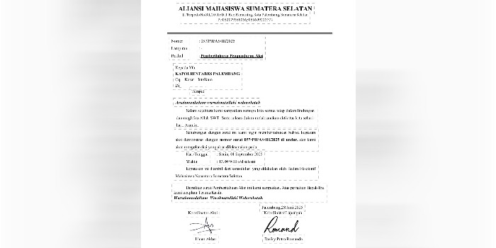 Pembatalan aksi demo tersebut disampaikan Aliansi Mahasiswa Sumatera Selatan dalam surat nomor: 057 / PH / AS / III / 2025 yang disampaikan ke Kapolrestabes Palembang Cq Kasat Intelkam yang ditandatangani Koordinator Aksi Irham Akbar dan Koordinator Lapangan Dwiky Patra Ramanda.