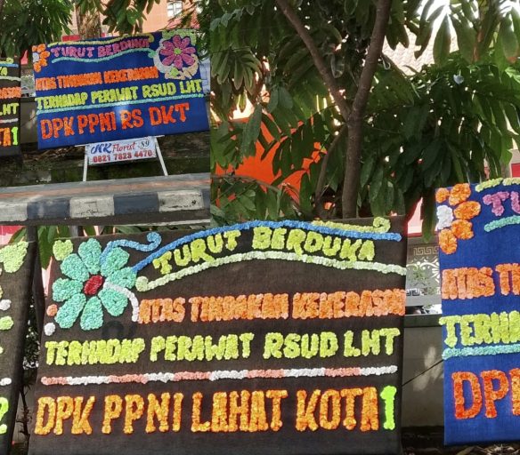 Sebagian papan bunga memuat tulisan turut berduka atas tindakan kekerasan terhadap perawat RSUD Lahat. Pesan ini dapat dibaca sebagai bentuk empati sekaligus penegasan sikap moral menolak kekerasan di lingkungan pelayanan kesehatan.