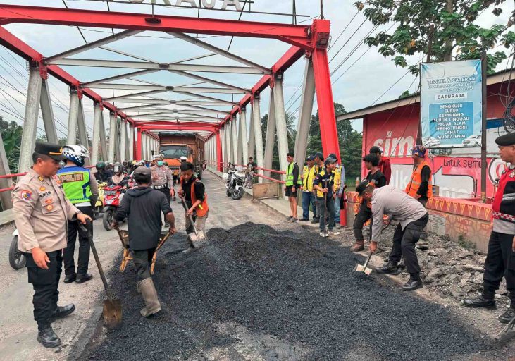 Kapolres OKU bersama jajaran pejabat utama serta unsur Balai Besar Jalan Nasional dan Dinas Lingkungan Hidup melaksanakan penambalan jalan berlubang sekaligus pembersihan sampah di sepanjang ruas jalan lintas Sumatera tersebut.